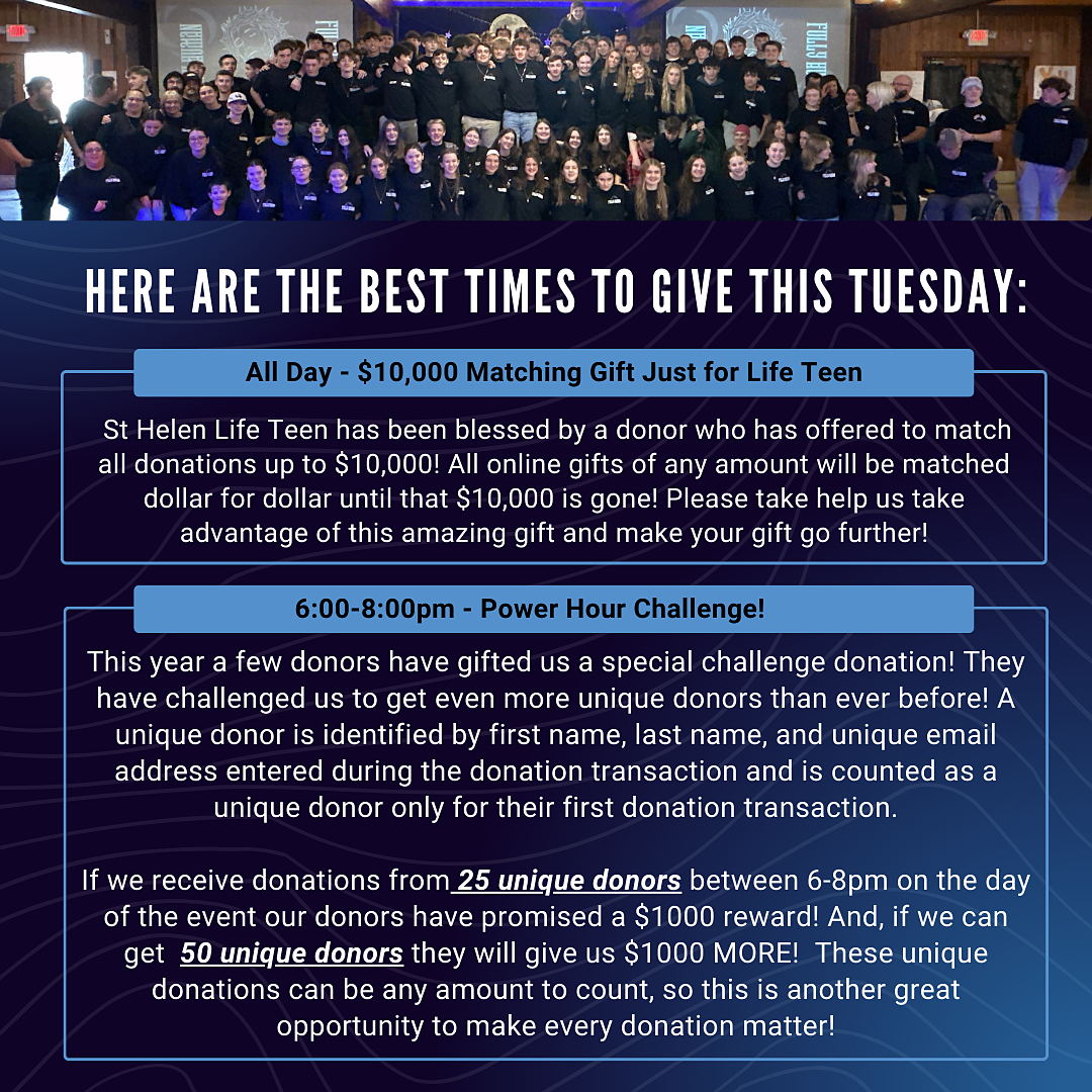As a Eucharist centered movement within the Roman Catholic Church, Life Teen leads teenagers and their families into a deeper relationship with Jesus Christ and His Church. With the Blessed Virgin Mary as our intercessor and guide, Life Teen seeks to unleash the fullness of the Sacramental power present within the young Church. Fundraisers like this one help finance events throughout the year to serve this mission. From catechetical and issue nights on Sundays, to biannual weekend long retreats, social events, service retreats, youth conferences and more. Your donations help keep us going and your prayers give us strength.