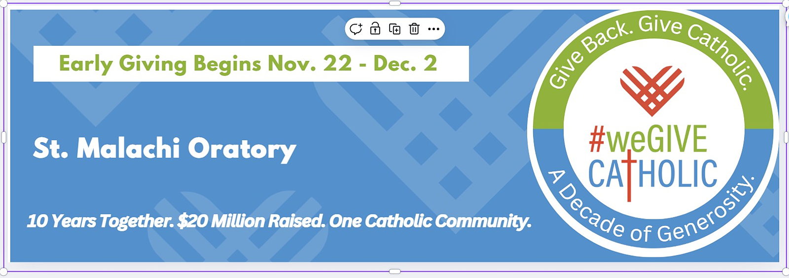 St. Malachi Oratory is excited to invite you to join us for this year’s #weGIVECATHOLIC campaign starting with Early Giving on November 22 and culminating on Giving Tuesday, December 2, 2025. Your donations will help us continue supporting all our ministries, including the Back Door, Monday and Saturday Meals, and Mother Teresa Ministry. Funding 2024/2025 ministry costs exceeded $100,000 for food, paper products, rental assistance and miscellaneous expenses.